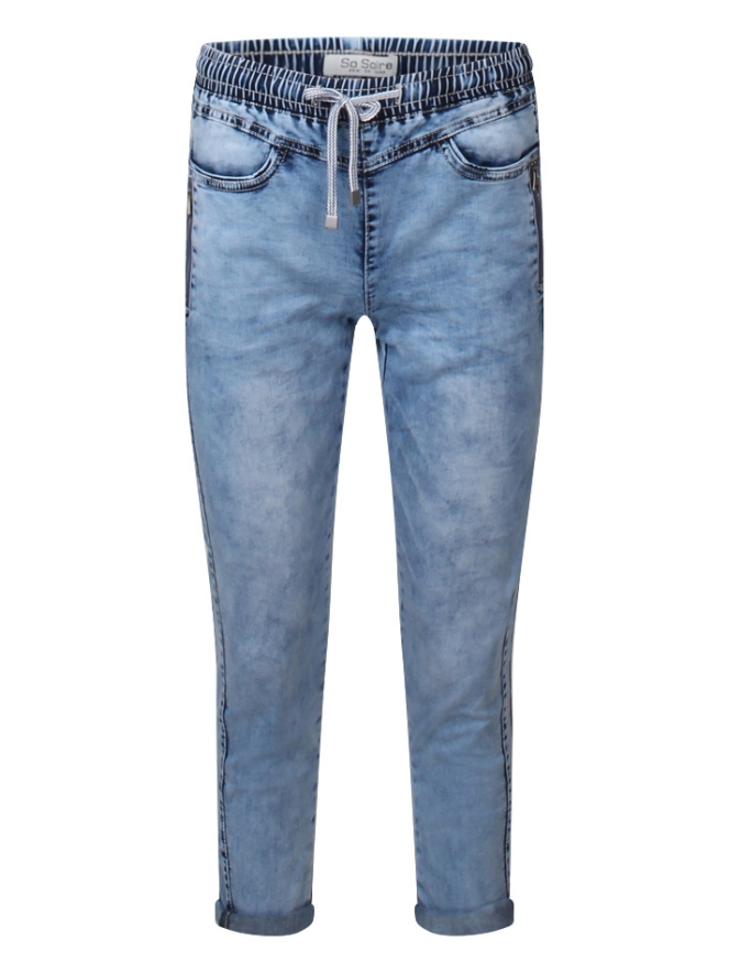 Deze zomerse jeans heeft een gewassen look. Deze broek draagt fijn door het elastiek in de taille, heeft 2 ritszakken, achterop twee gewone zakken en een koord aan de voorkant.