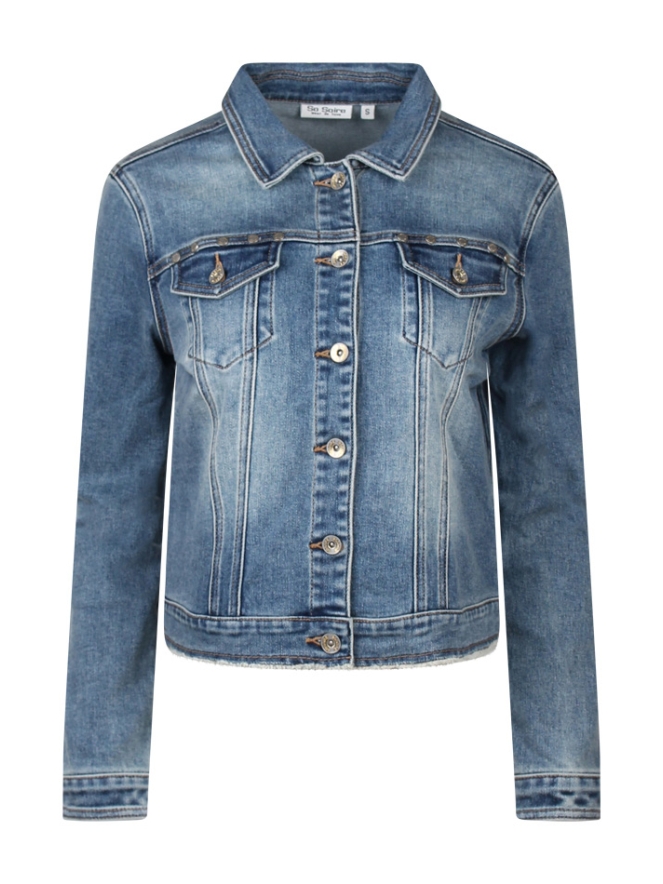Dit denim spijkerjasje heeft twee klepzakken en een gerafelde afwerking aan de onderkant. Aan de bovenkant van de klepzakjes zitten studs.