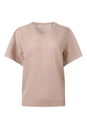 Deze top heeft een driekwart mouw, kleine V hals met een sierkoord. Onder bij de taille heeft deze top een elastiek zodat je hem kunt laten bollen.