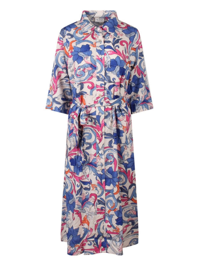 Deze lange jurk is een doorknoop model met polo kraagje en mouwen tot de elleboog. In de middel zit een ceintuur.