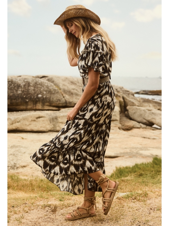 Deze lange overslag strokenrok heeft door de overslag een V hals, ruche vlindermouw en een elastiek in de taille.