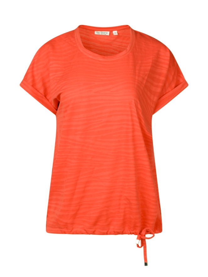 Dit T-shirt heeft een omslag mouwtje, horizontale zebra print in gelijke kleur met een koord onder in de taille. Deze kan iets aangetrokken worden om het shirt te laten bollen maar hoeft natuurlijk niet.