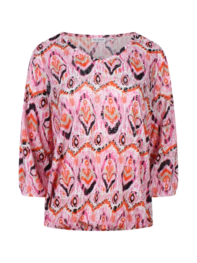 Deze top met driekwart mouwen heeft een V hals en onderaan in de taille een elastiek om het shirt te kunnen laten bollen.