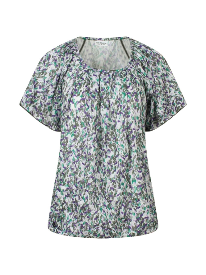 Deze top met vlindermouw heeft een elastiek onder in de taille welke het shirt laat bollen.