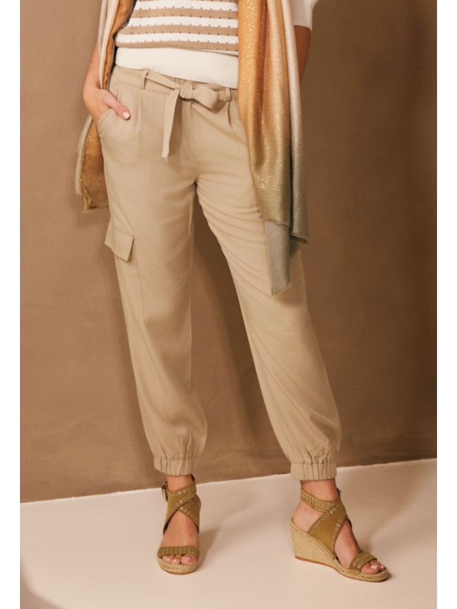 Deze leukerd met bijpassende strikceintuur heeft twee cargozakken, steekzakken en sierzakken achterop. De stof draagt soepel en het elastiek onder bij de enkels geeft een leuk sportief effect.