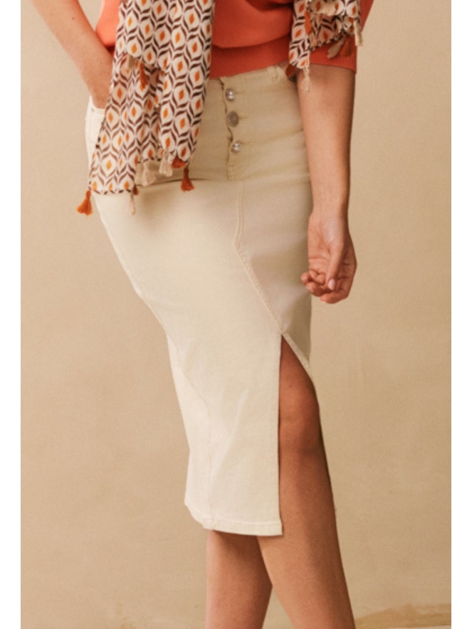 Hippe rok in denim ecru met split aan de voorkant. Dit is een 5 pocket model en heeft sjiecke knopen op de rok! leuk te combineren met een hip T-shirt of top.