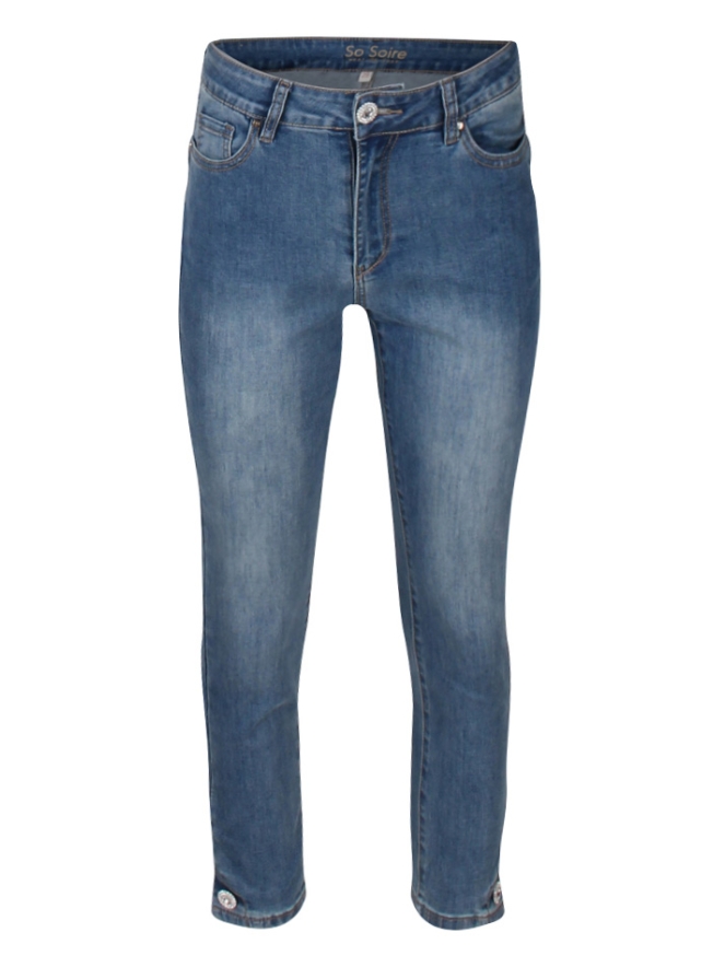 Fraaie slim fit spijkerbroek van ons eigen merk So Soire in een mooie zomerse wassing. Deze broek heeft bij de sluiting en onder bij de broekspijp een strassknoop. Let op, deze broek is een korter model (26 inch) en doet het erg goed op een vlotte sneaker.