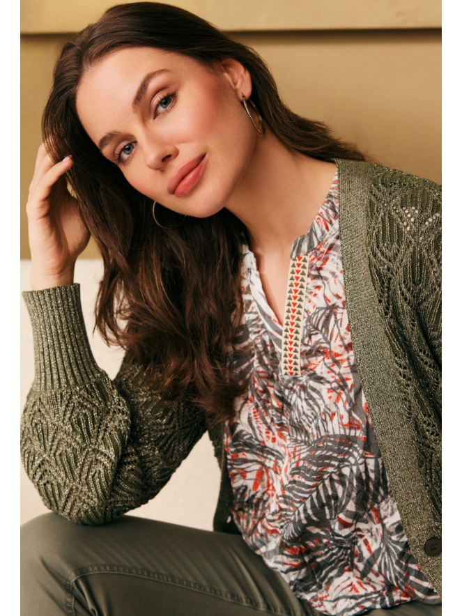 Fijn zomers vestje met diepe V uitsnede aan de voorkant. Door het garen zit een glitterdraad verweven, ook is het ajour gehaakt en dus licht doorzichtig. Daarom raden we het aan om eer een hemdje onder te dragen. Leuk te combineren met een zomerse rok.