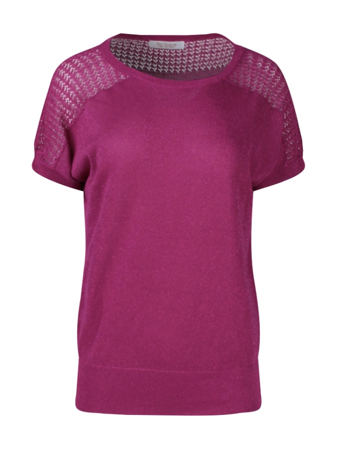 Deze dunne trui met korte mouw heeft een doorschijnend ajour motief op de schouder. Door het garen zit een glitter draad verweven in dezelfde kleur voor een extra twist. Leuk te combineren op een spijkerbroek, korte broek of dreikwart broek!