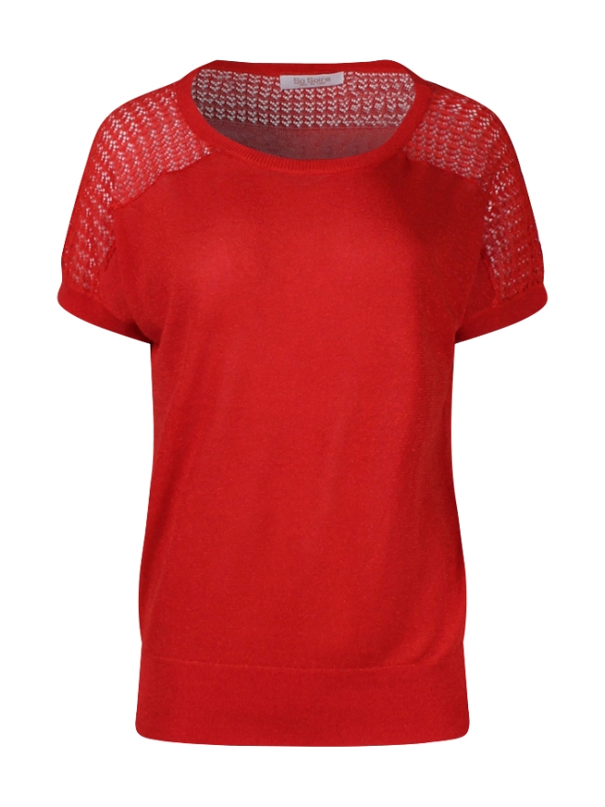 Deze dunne trui met korte mouw heeft een doorschijnend ajour motief op de schouder. Door het garen zit een glitter draad verweven in dezelfde kleur voor een extra twist. Leuk te combineren op een spijkerbroek, korte broek of dreikwart broek!