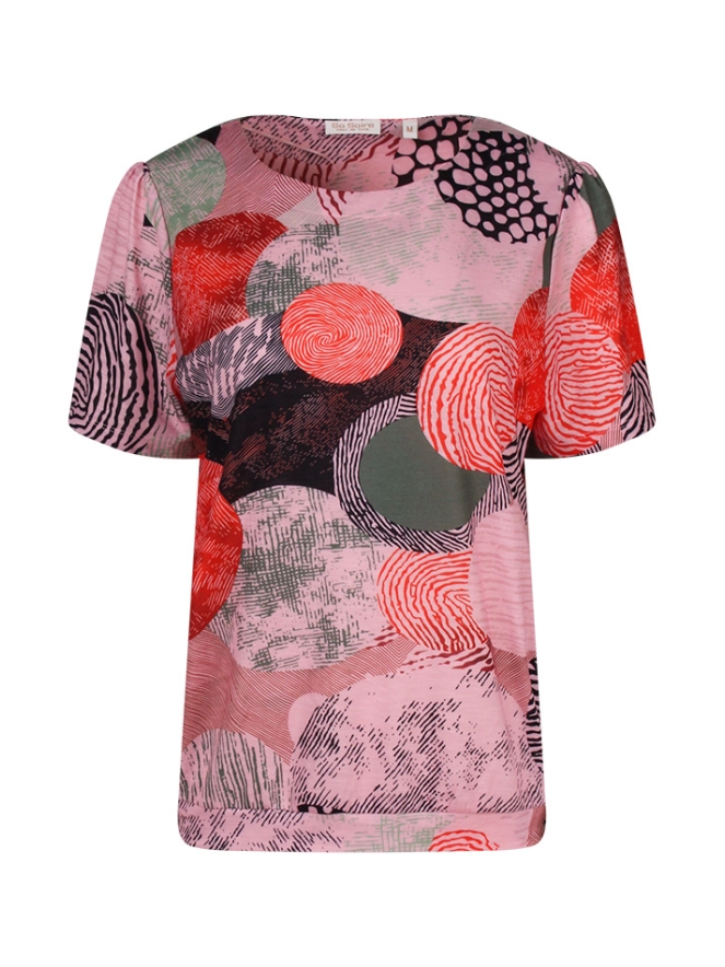 Dit T-shirt met bollen design heeft een band onderaan de middel. Leuk te combineren op een witte driekwart broek maar doet het ook goed op een zomerse korte of lange broek.
