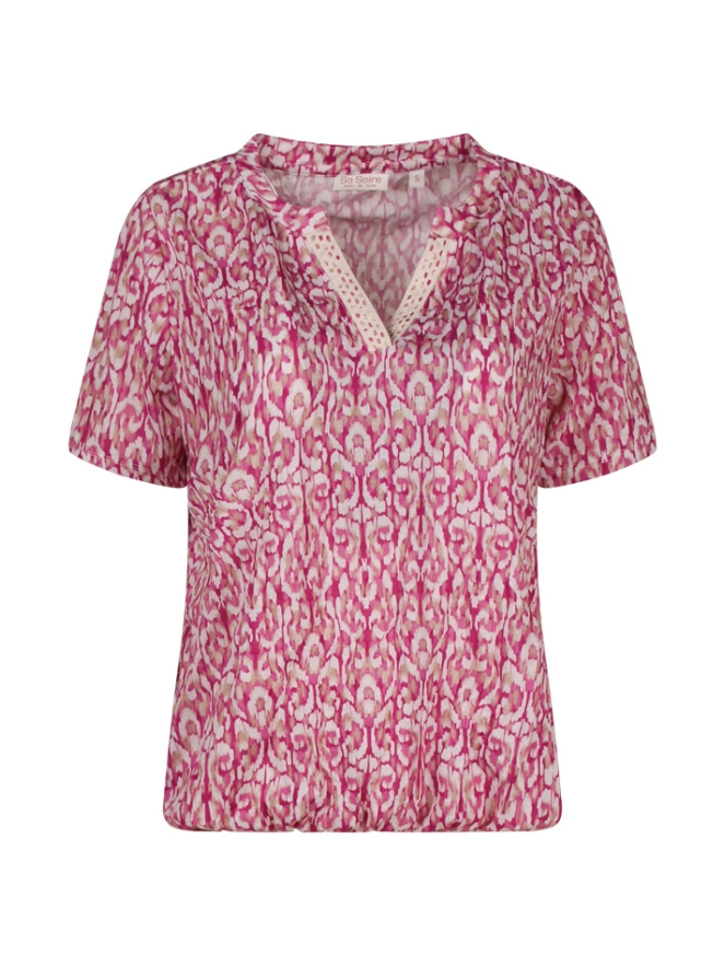 Fraaide top in diverse kleur designs met kleine V hals en onder bij de middel een elastiek zodat de top die iets ruim valt gebold kan worden. Casual item geschikt op iedere jeans.