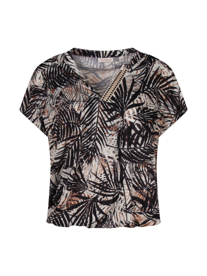 T-shirt met tropische bladprint en mooie inkeping in de hals afgezet met een biesje. Shirt valt iets wijder en draagt comfortabel door de soepel vallende stof. Met een elastiek in de taille.