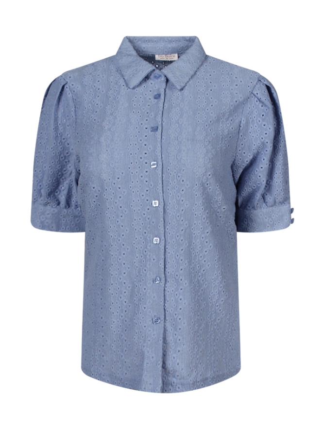 Deze fraaie blouse van fancy ajour is een doorknoper met leuke pofmouwen. Voor een nette look is deze top leuk te combineren met een pantalon. Hou je van een meer casual look? Dan is een spijkerrok bij deze blouse ook een topcombinatie!