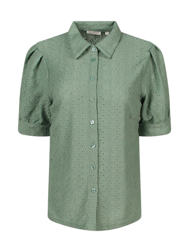 Deze fraaie blouse van fancy ajour is een doorknoper met leuke pofmouwen. Voor een nette look is deze top leuk te combineren met een pantalon. Hou je van een meer casual look? Dan is een spijkerrok bij deze blouse ook een topcombinatie!