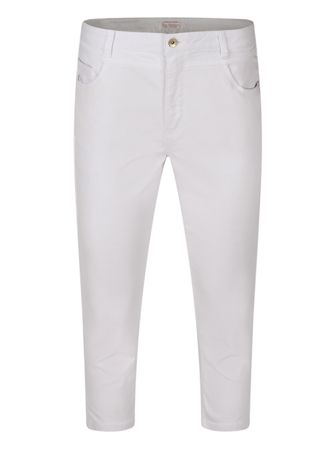 Deze driekwart damesbroek van So Soire uit de zomercollectie is gemaakt van comfortabele twill met een flatterende 23 inch lengte. Het effen ontwerp heeft een klassieke 5-pocket stijl en een rits- en knoopsluiting. Een subtiel splitje aan de pijpen voegt een elegant detail toe, terwijl de stretchstof zorgt voor een comfortabele en vrouwelijke pasvorm. Ideaal voor dagelijks gebruik en perfect voor op de fiets.