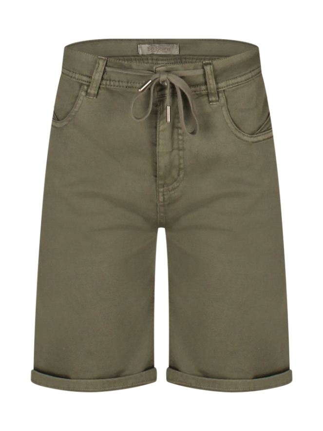 Deze korte damesbroek van So Soire is de perfecte mix van comfort en een trendy look. Gemaakt van zachte joggdenim met stretch, waardoor je geniet van optimale bewegingsvrijheid. Het koordje in de taille zorgt voor een sportieve touch en een verstelbare pasvorm. Met een effen design, rits- en knoopsluiting en praktische 4-pocket afwerking is deze broek ideaal voor zomerse dagen. Combineer ?m met een luchtige top of T-shirt voor een relaxte, casual outfit!