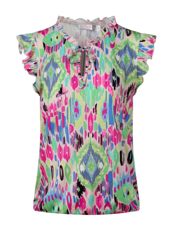 Wij worden hier vrolijk van! Dit kleurrijke singlet met fraaie ruches ronde de hals en op de schouder heeft een druppeluitsparing aan de voorkant met een koordje. Leuk te combineren met rokken, broeken lang of kort.