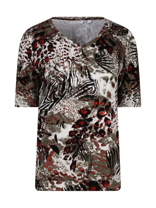 Dit dames t-shirt met een opvallende dieren- en bladprint is versierd met strassteentjes die het geheel een subtiele sparkle geven. Het t-shirt heeft een bredere band aan de onderkant, waardoor het comfortabel draagt.