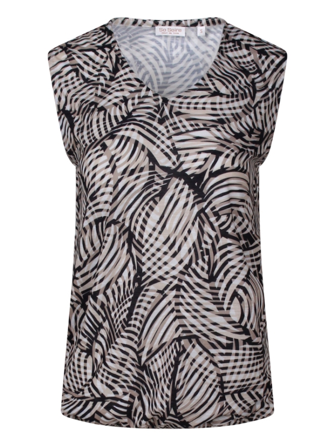 Dit dames singlet heeft een zomerse bladprint en een flatterende V-hals. Dankzij het elastiek in de zoom sluit de top mooi aan op het lichaam, wat zorgt voor een comfortabele en vrouwelijke pasvorm. Ideaal voor een luchtige en stijlvolle zomerlook!