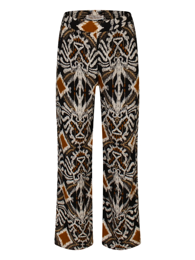 Deze broek van So Soire heeft een prachtige incadessin print. De broek heeft rechte pijpen voor een moderne uitstraling en is voorzien van twee steekzakken voor extra functionaliteit. Het elastiek in de taille aan de achterkant zorgt voor een comfortabele pasvorm die zich perfect aan je lichaam aanpast. Deze broek is ideaal te combineren met de bijpassende top (Z90760) voor een complete boho-chique outfit.