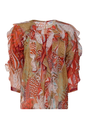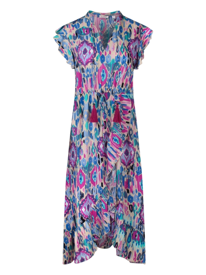 Deze damesjurk heeft een prachtig ikatdessin dat een unieke, boho-geïnspireerde uitstraling geeft. De jurk is voorzien van een strikdetail bij de hals, met leuke kwastjes die een speelse en elegante touch toevoegen. Het overslagrokmodel zorgt voor een vrouwelijk en flatterend silhouet, terwijl de ruches op de schouders het geheel een extra verfijnde uitstraling geven. Daarnaast is de jurk uitgerust met een koordje in de taille, waarmee je de jurk kunt tailleren voor een perfecte pasvorm.