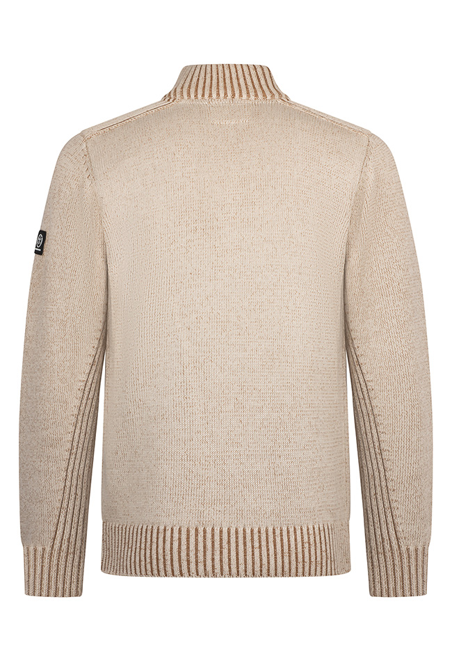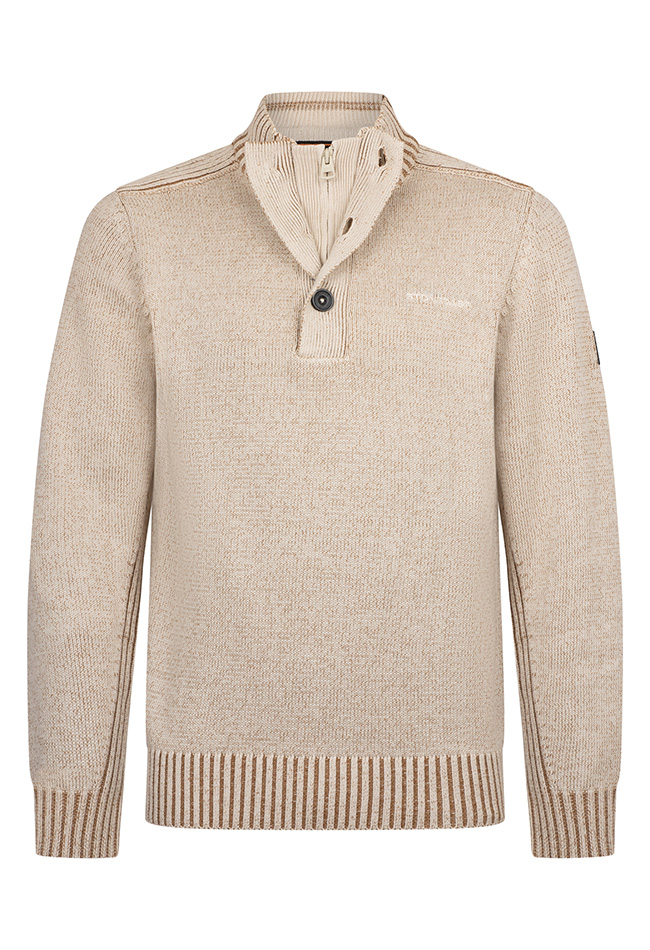 Warme pullover met dubbele kraag met rits en knopen. Deze trui draag je eenvoudig over een T-shirt maar doet het ook goed over een net overhemd voor een casual nette afgeklede look.