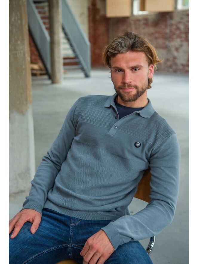 Mooie trui voor heren met verschillende structuren. Met een polo kraag dus ideaal om er nog een net overhemd onder te kunnen dragen.