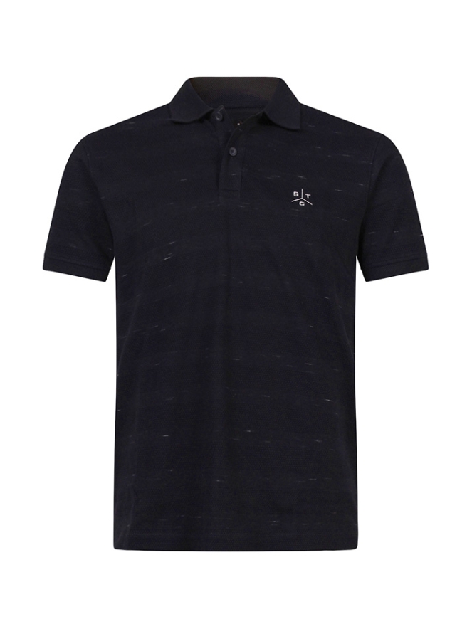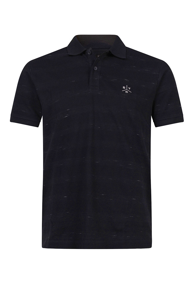 Herenpolo met korte mouwen, uitgevoerd in een katoen-polyester mix met injected structuur en een subtiel reliëfstreepdessin voor een moderne, verfijnde uitstraling. Het kleine borduurtje op de borst geeft een stijlvol en herkenbaar detail.