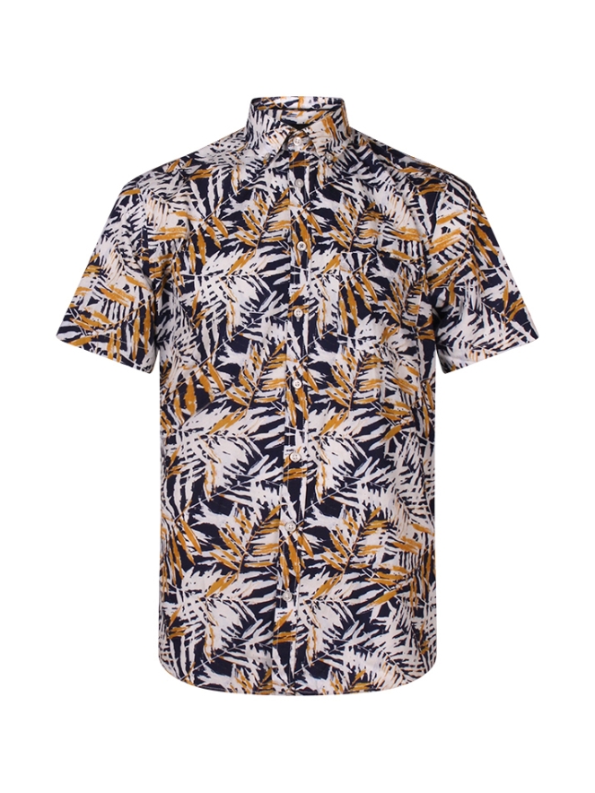 Dit herenoverhemd van Stonecast is een stijlvolle aanvulling op je zomergarderobe. Gemaakt van 100% katoen in een luchtige kwaliteit en uitgevoerd met een bladerdessin in marineblauw en okergeel, combineert dit overhemd comfort met een moderne, zomerse uitstraling. De klassieke button-down kraag, korte mouwen en regular fit zorgen voor een relaxte en verzorgde pasvorm, terwijl het borstzakje en de knoopsluiting het ontwerp compleet maken. Perfect om te dragen met een chino of short voor een casual, maar verzorgde look. Dankzij de ademende katoenstof is dit overhemd ideaal voor warme dagen.