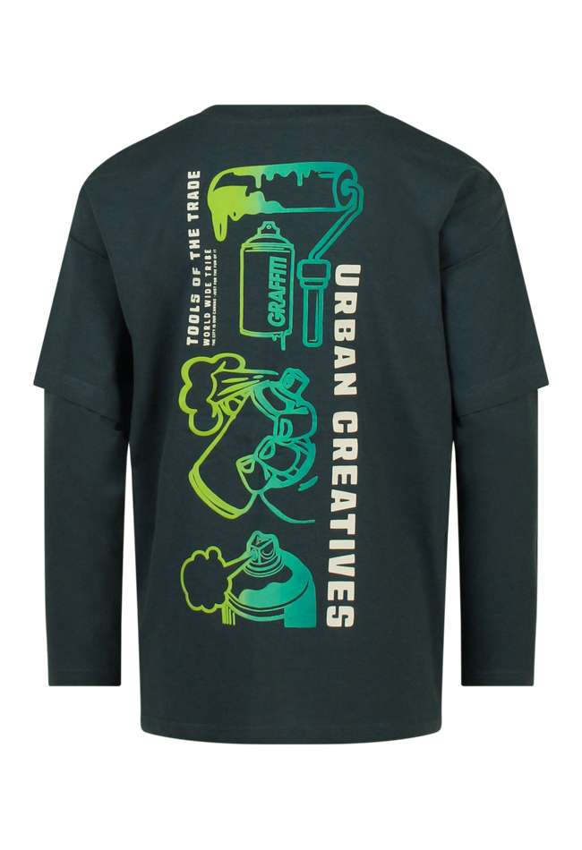 Stoer T-shirt met een dubbele mouwinzet en mooie graffiti prints op de voor een achterkant. Dit shirt laat zich goed combineren met mooie sneakers een spijkerbroek en bij kouder weer een overshirt eroverheen.