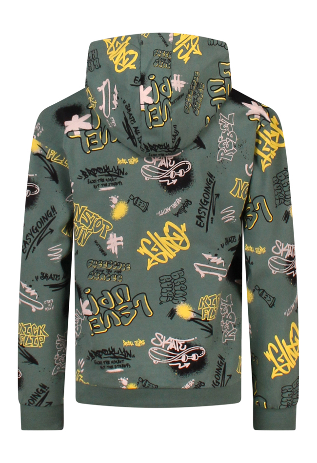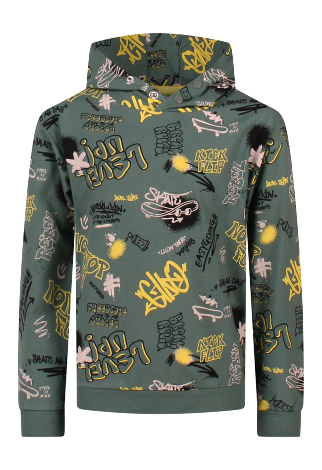 Fijne hoodysweater waar je lekker in weg kan duiken! De drukke graffiti print zit vol met tekeningen en teksten. Voor stoere boys!