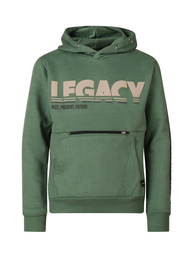 He, dit is een leuke hoody sweater! Met een print voorop en op de mouw heeft deze zachte trui naast zijn kangeroezak nog een extra ritsvak voorop! Legacy, past, present, future!