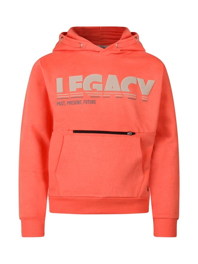 He, dit is een leuke hoody sweater! Met een print voorop en op de mouw heeft deze zachte trui naast zijn kangeroezak nog een extra ritsvak voorop! Legacy, past, present, future!