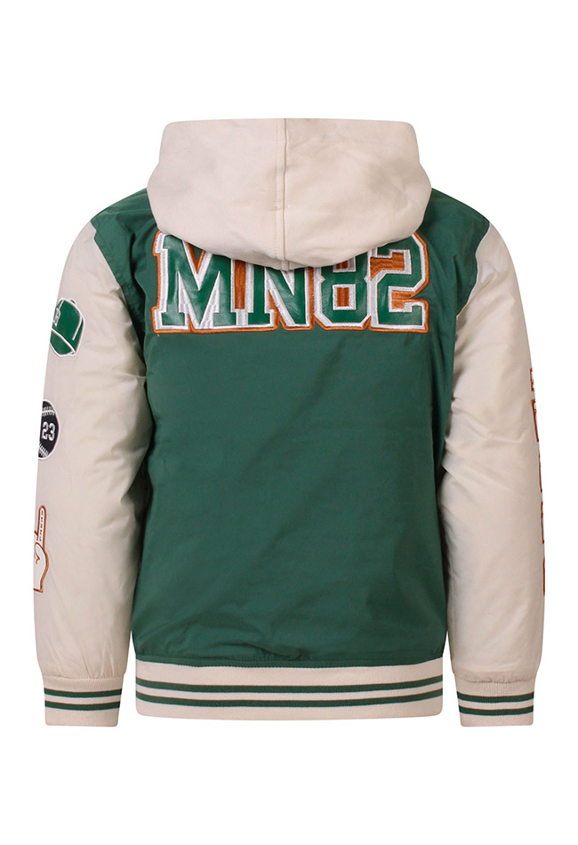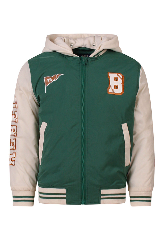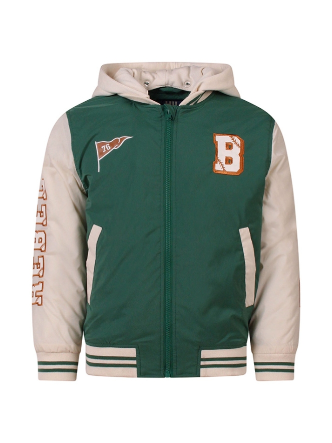 Dit stoere baseballjack voor jongens is voorzien van een sweat capuchon, opvallende badges en een afneembare capuchon.