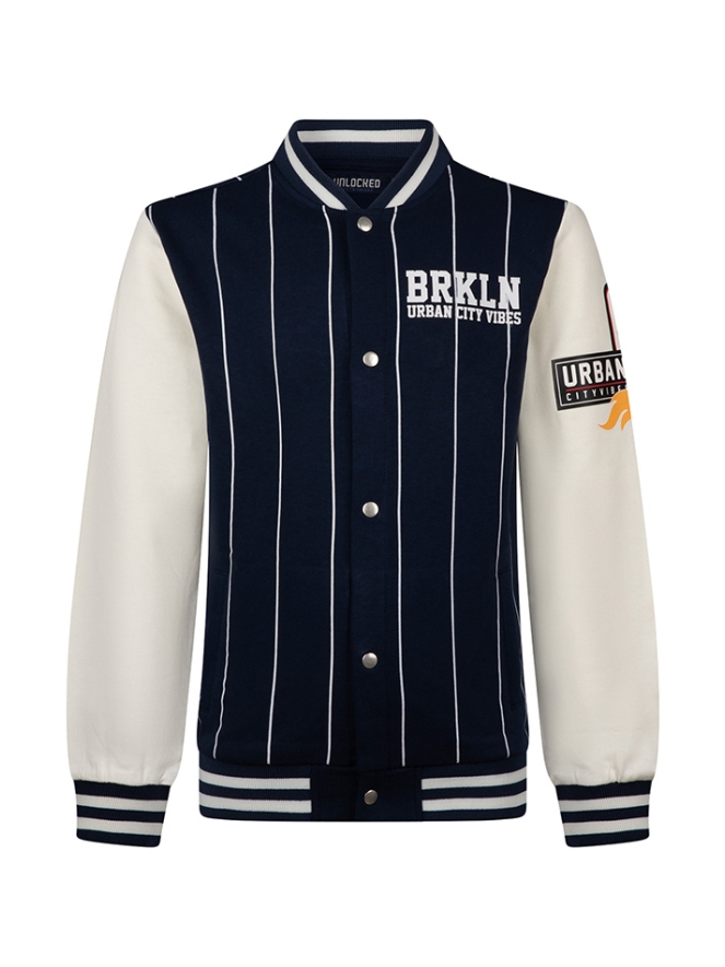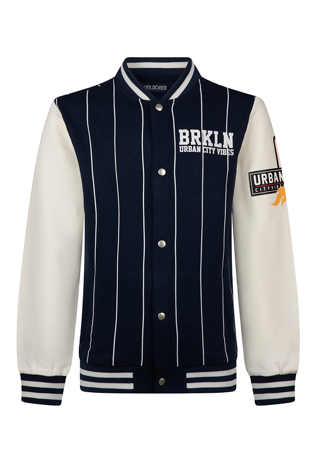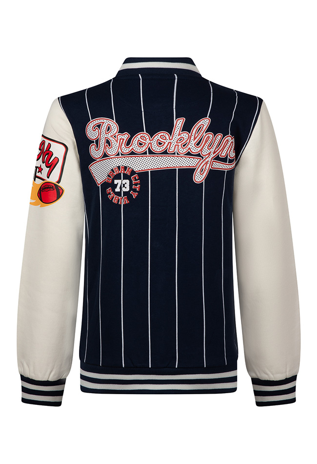 Brooklyn urban city vibes! Dit sportieve baseball vestje met verticale strepen heeft meerdere prints verdeeld over de borst, rug en mouw! Ook leuk om los te dragen!