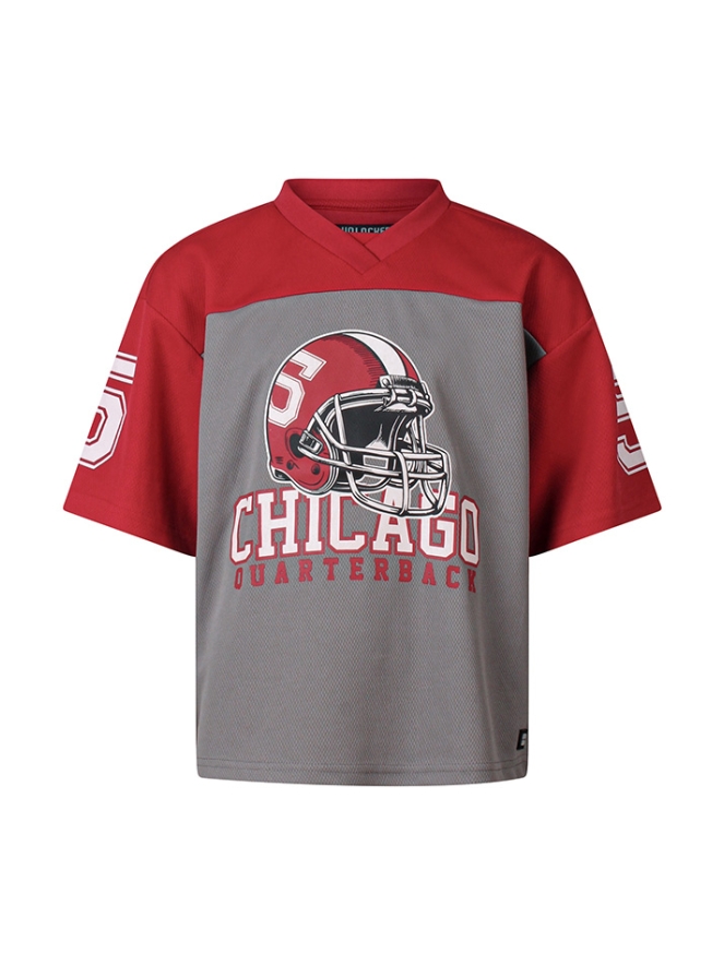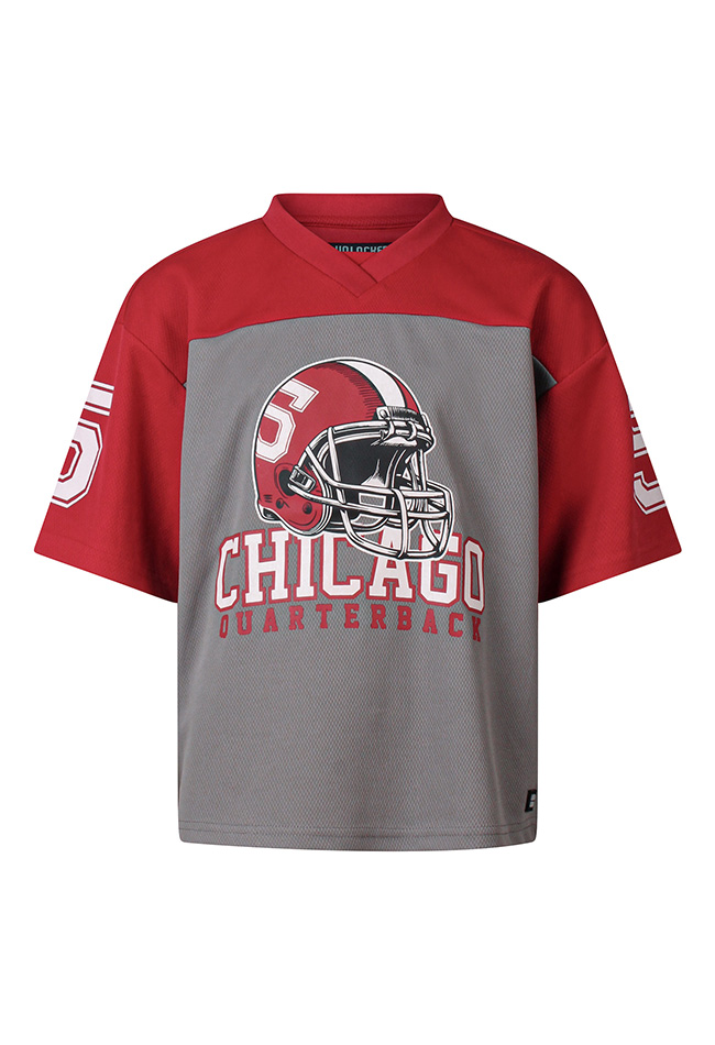 Een krachtig shirt voor echte sportfans die klaar zijn om te scoren! Dit stoere American football shirt is perfect voor sportieve jongens. De opvallende Chicago quarterback print met helm geeft het shirt een echte wedstrijd uitstraling, alsof je midden op het veld staat.Het model is voorzien van een V-halsje, wat zorgt voor een authentieke sportieve touch. Gemaakt van comfortabele stof is dit shirt ideaal voor dagelijks gebruik, buitenspelen of om gewoon in te relaxen.