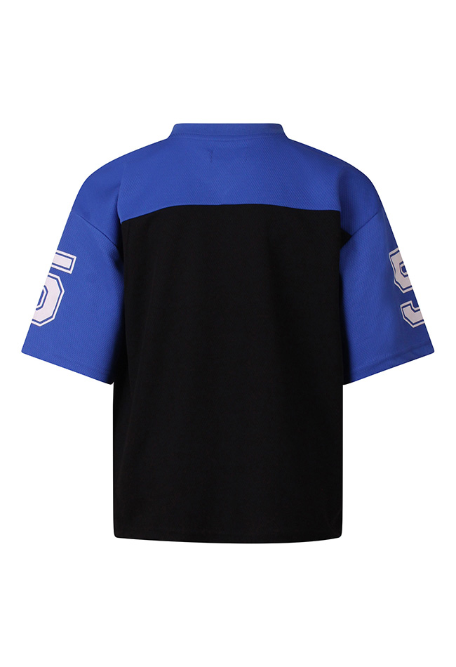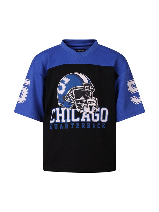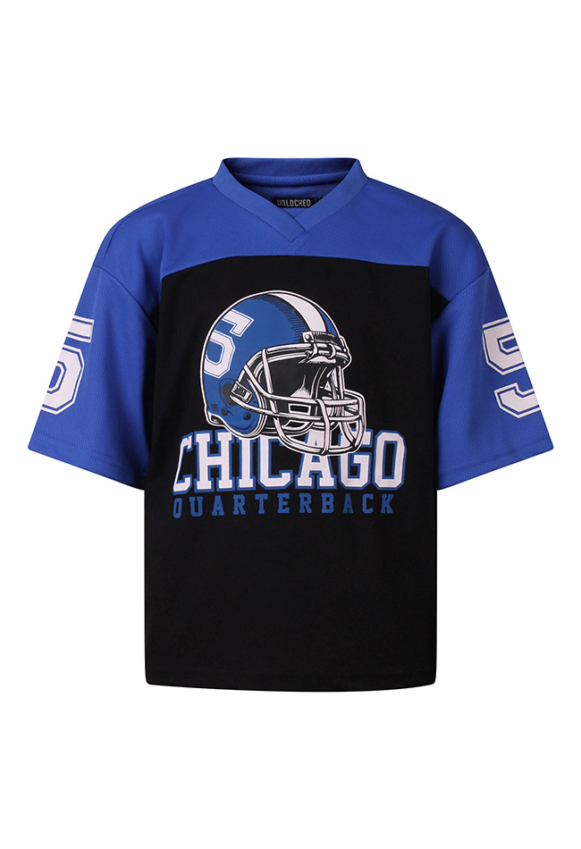 Een krachtig shirt voor echte sportfans die klaar zijn om te scoren! Dit stoere American football shirt is perfect voor sportieve jongens. De opvallende Chicago quarterback print met helm geeft het shirt een echte wedstrijd uitstraling, alsof je midden op het veld staat.Het model is voorzien van een V-halsje, wat zorgt voor een authentieke sportieve touch. Gemaakt van comfortabele stof is dit shirt ideaal voor dagelijks gebruik, buitenspelen of om gewoon in te relaxen.