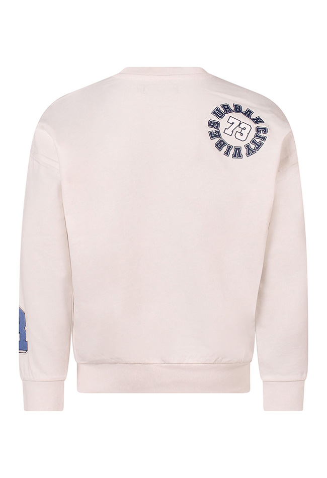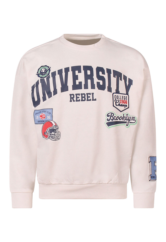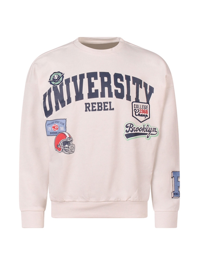 University Rebel! Deze stoere sweater vol met prints en badges heeft geen uitleg nodig. Spijkerbroek eronder en klaar! Hij valt wat wijder want het is een boxy fit.