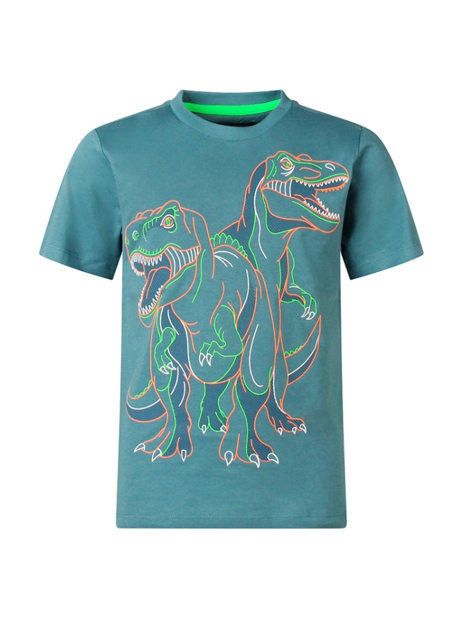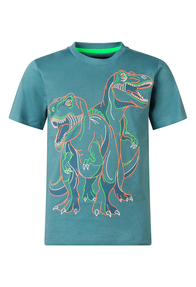 Laat je kleine avonturier brullen van plezier met dit stoere T-shirt voor jongens. Het shirt is bedekt met coole dino?s, alsof ze zo uit Jurassic Park zijn gestapt ? Grrrrr! Perfect voor jonge ontdekkingsreizigers die van spannende verhalen en prehistorische dieren houden.