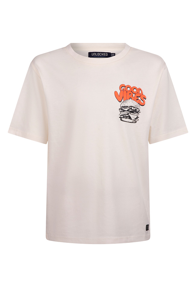 Geef elke outfit een speelse en trendy uitstraling met dit stoere jongens T-shirt van Unlocked. Dit shirt is uitgevoerd in een comfortabele regular fit met een licht boxy effect, waardoor het perfect zit en makkelijk te combineren is met elke casual look. Het T-shirt heeft een zachte feel en ademend draagcomfort, ideaal voor dagelijks gebruik. Op de borst vind je een opvallende puffprint van een burger met de tekst 'Good Vibes'. De achterkant maakt echt een statement met een grote foodprint van een burger en dezelfde vrolijke tekst. Dankzij de ronde hals en korte mouwen heeft dit shirt een tijdloze en veelzijdige uitstraling. Perfect voor jongens die houden van een coole, casual stijl met een speelse twist.