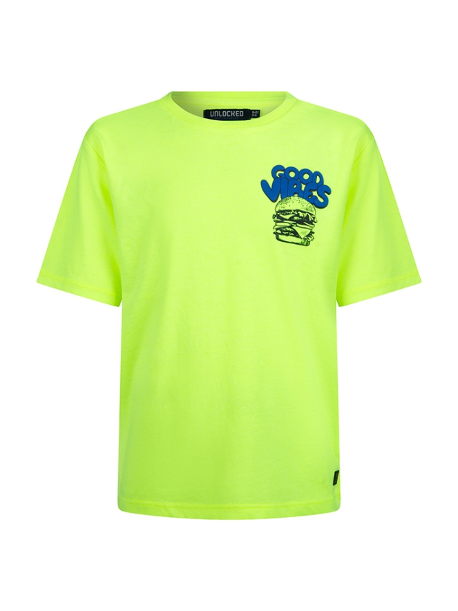 Geef elke outfit een speelse en trendy uitstraling met dit stoere jongens T-shirt van Unlocked. Dit shirt is uitgevoerd in een comfortabele regular fit met een licht boxy effect, waardoor het perfect zit en makkelijk te combineren is met elke casual look. Het T-shirt heeft een zachte feel en ademend draagcomfort, ideaal voor dagelijks gebruik. Op de borst vind je een opvallende puffprint van een burger met de tekst 'Good Vibes'. De achterkant maakt echt een statement met een grote foodprint van een burger en dezelfde vrolijke tekst. Dankzij de ronde hals en korte mouwen heeft dit shirt een tijdloze en veelzijdige uitstraling. Perfect voor jongens die houden van een coole, casual stijl met een speelse twist.
