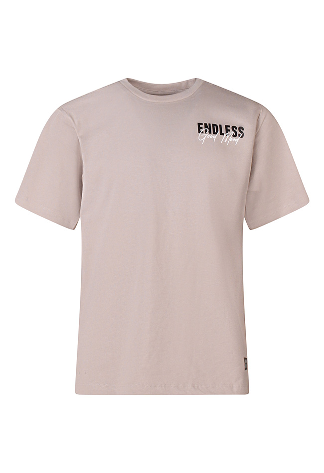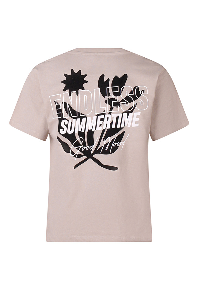 Breng een zonnige vibe in je outfit met dit T-shirt in een effen kleur, voorzien van een vrolijke ?Endless Summertime Good Mood? print op zowel de voor- als achterkant. Het shirt straalt zomerse energie uit en past perfect bij een casual, relaxte look.De eenvoudige effen basis gecombineerd met de speelse print maakt het gemakkelijk te combineren met shorts en jeans. Let op, dit shirt valt wat wijder want is een boxy fit.