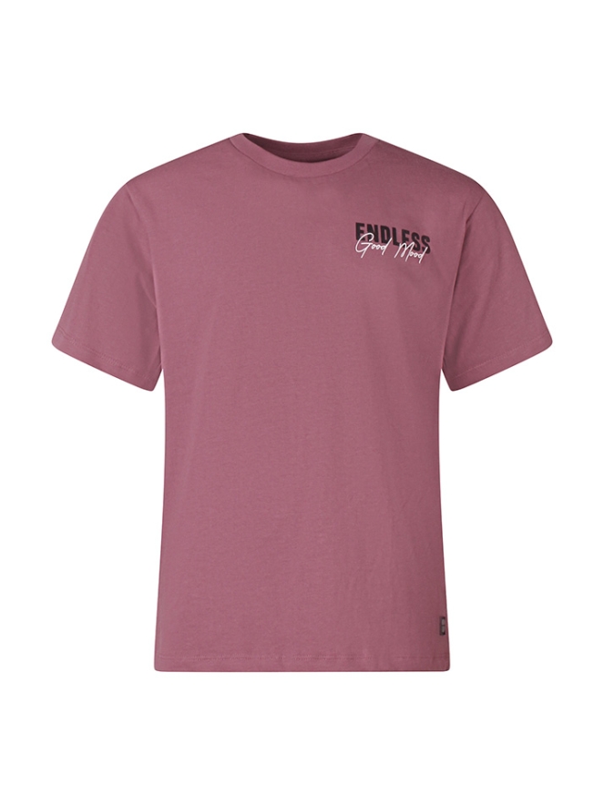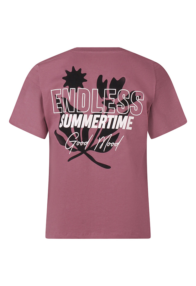 Breng een zonnige vibe in je outfit met dit T-shirt in een effen kleur, voorzien van een vrolijke ?Endless Summertime Good Mood? print op zowel de voor- als achterkant. Het shirt straalt zomerse energie uit en past perfect bij een casual, relaxte look.De eenvoudige effen basis gecombineerd met de speelse print maakt het gemakkelijk te combineren met shorts en jeans. Let op, dit shirt valt wat wijder want is een boxy fit.