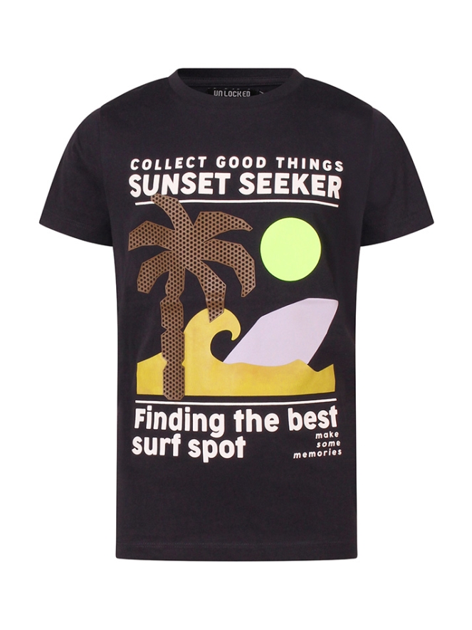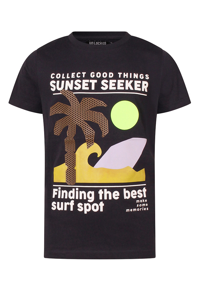 Sunset seeker T-shirt van Unlocked met een prachtige grote print op de voorkant. Finding the best surf spot!