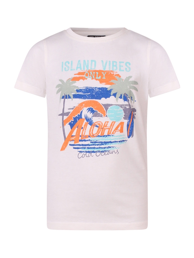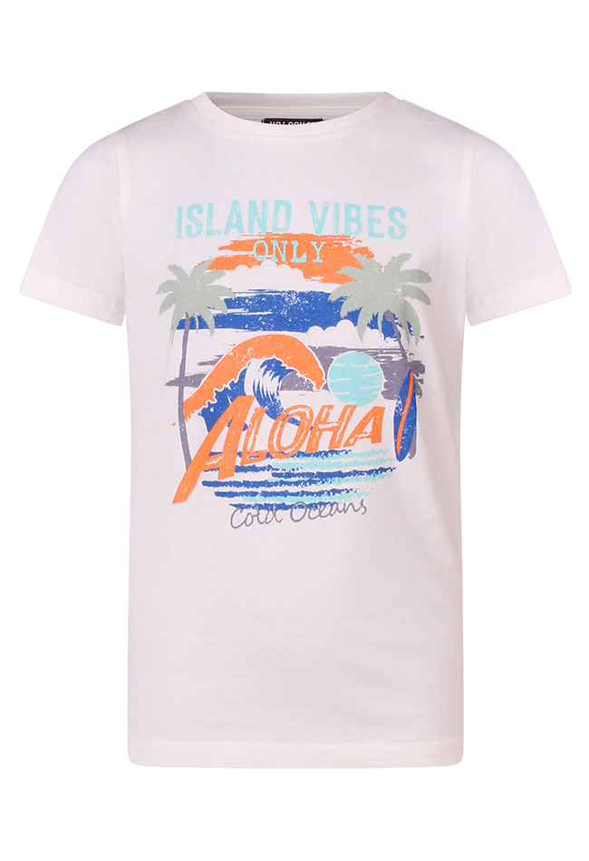 Aloha boys! Dit T-shirt heeft een tropische aloha print voorop in eiland sfeer! Voor een relaxte look goed te combineren met een sportieve korte broek of mooie denim!!