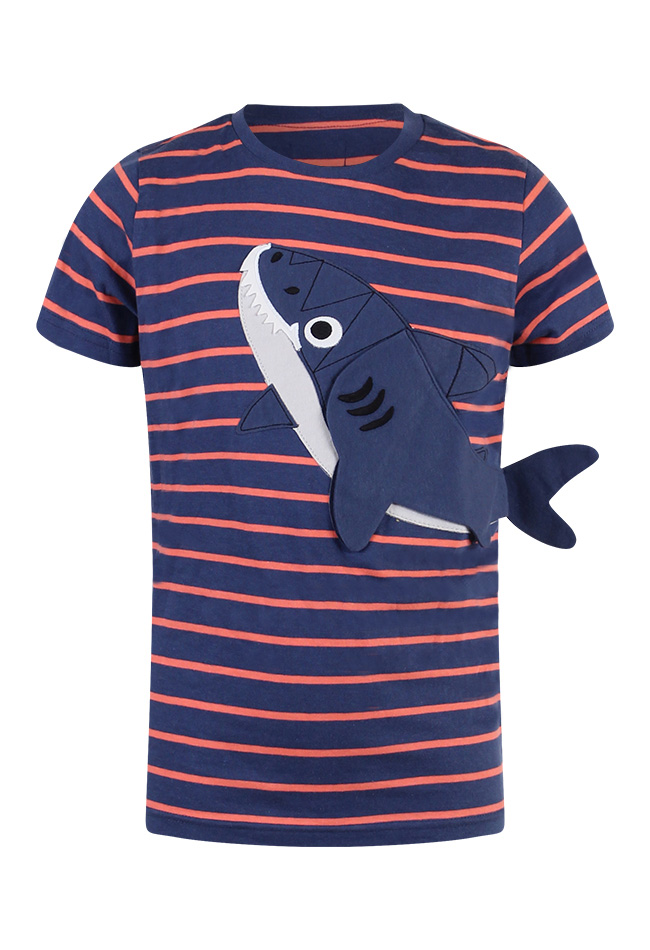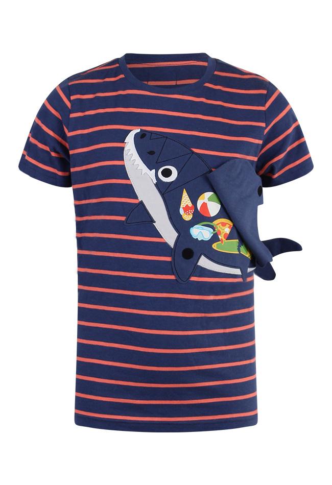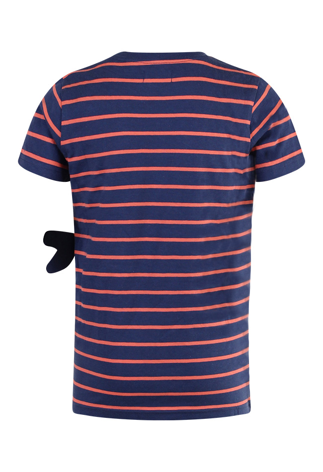Dit T-shirt met korte mouwen heeft een gestreept patroon. Op de voorkant zit een haai applicatie met flap. Als je de flap opent kun je zien wat de haai die dag gegeten heeft. Het T-shirt is verkrijgbaar in twee kleuren.