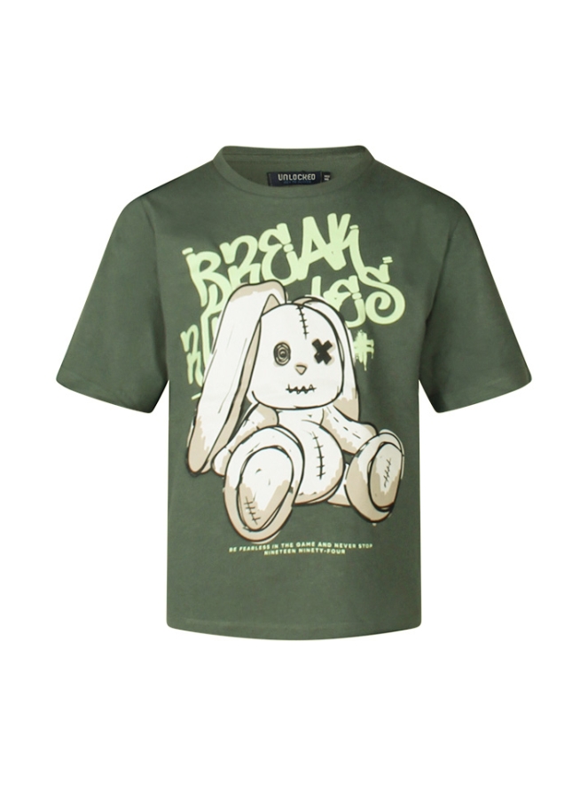 Dit T-shirt heeft een Boxy fit en valt daarom wat wijder. Met grote print met een geblesseerd konijn.