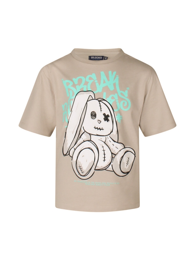 Dit T-shirt heeft een Boxy fit en valt daarom wat wijder. Met grote print met een geblesseerd konijn.