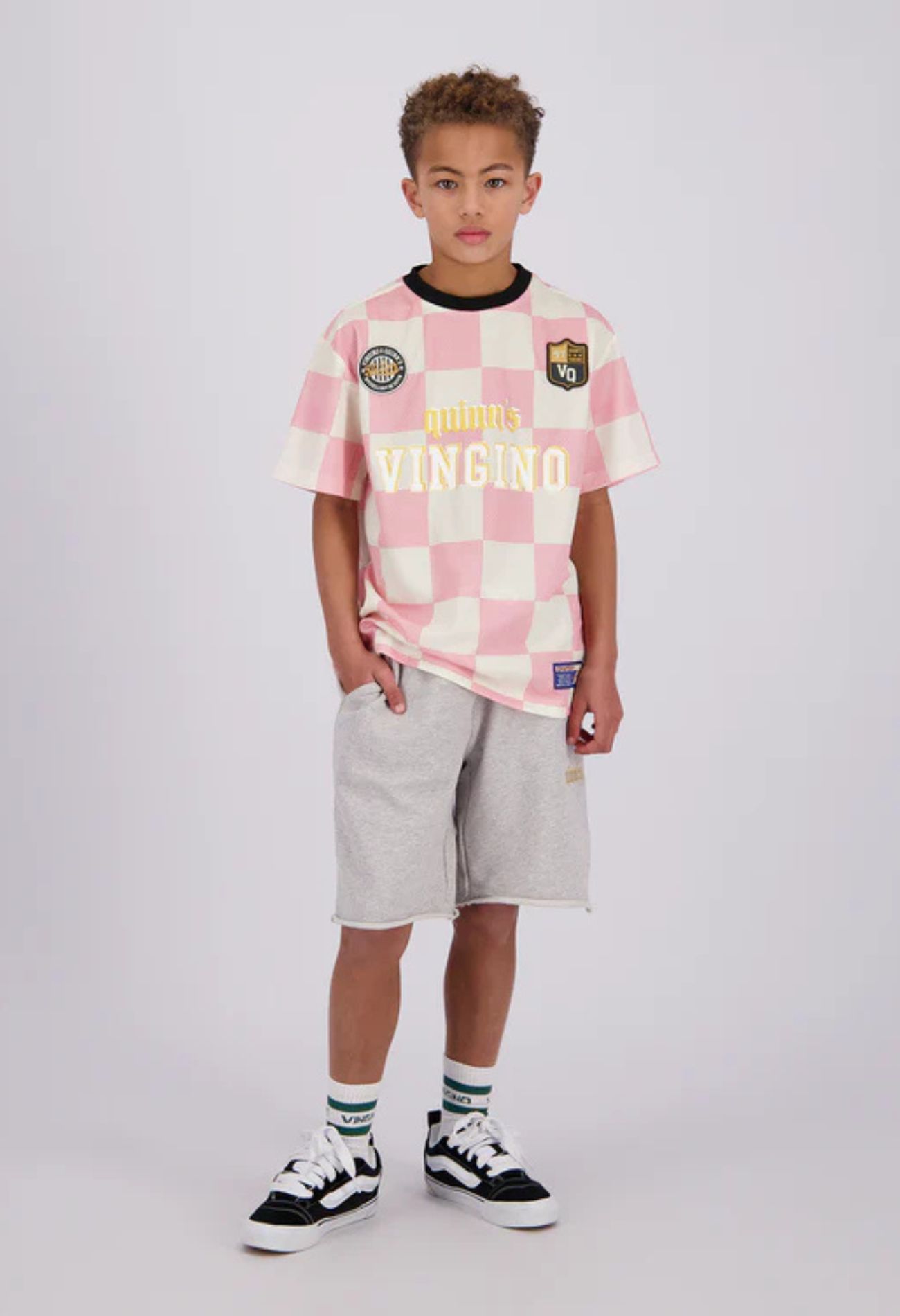 Laat je kind stralen met Hoga van Vingino. Dit zwarte checkered t-shirt is perfect voora alle jongens en meisjes. Met een oversized pasvorm is dit kledingstuk ideaal voor elke dag. Een topper uit de Vingino X Quinns lijn, klaar voor school en avontuur.